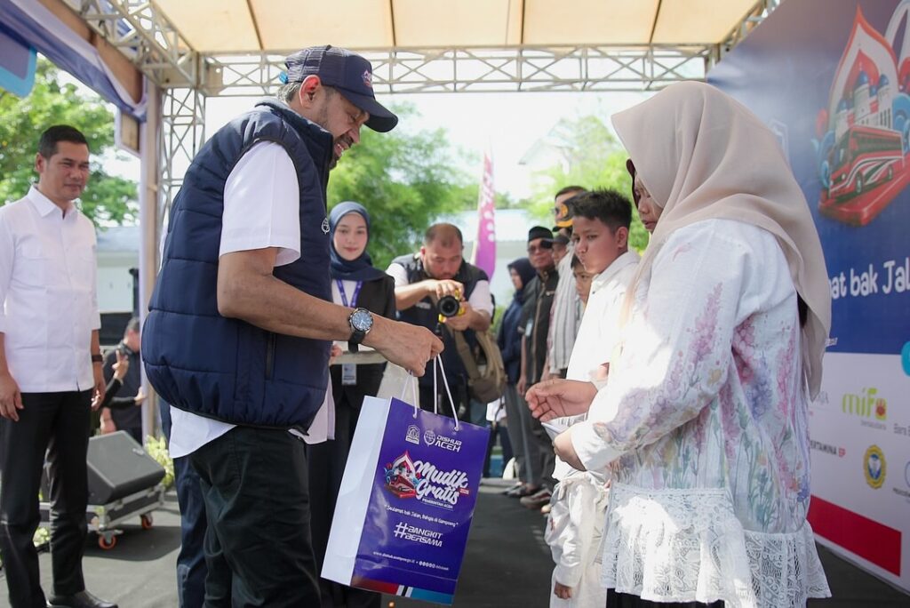 Gubernur Aceh H. Muzakir Manaf (Mualem) juga menyerahkan santunan kepada anak yatim saat melepas rombongan peserta Program Mudik Gratis 2026. Foto: Ist