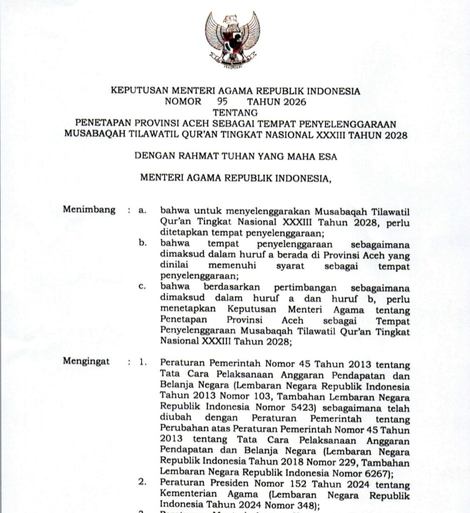 BANDA ACEH – Pemerintah Republik Indonesia melalui Menteri Agama resmi menetapkan Provinsi Aceh sebagai tuan rumah penyelenggaraan Musabaqah Tilawatil Qur’an (MTQ) Tingkat Nasional XXXIII yang akan digelar pada tahun 2028.